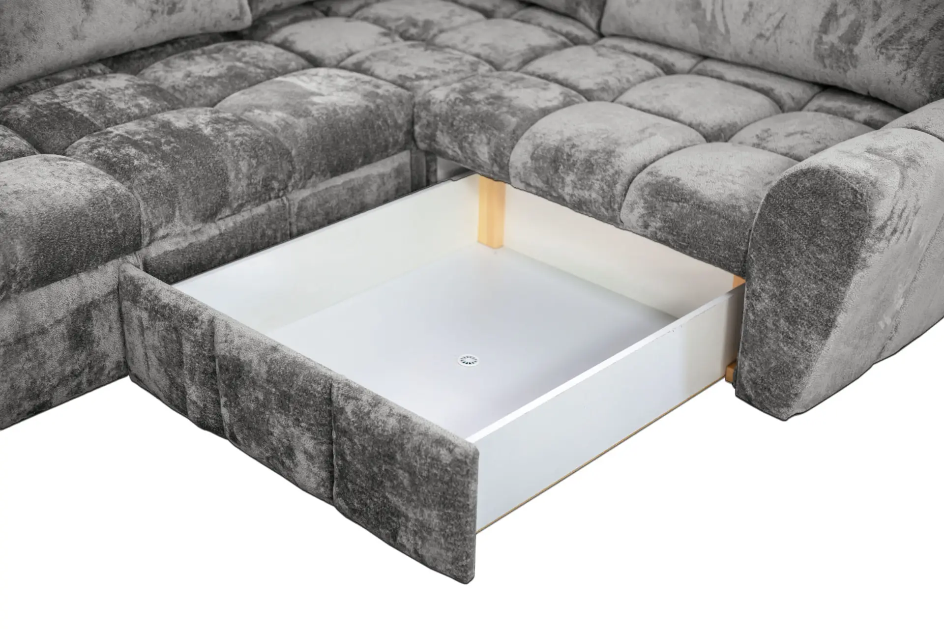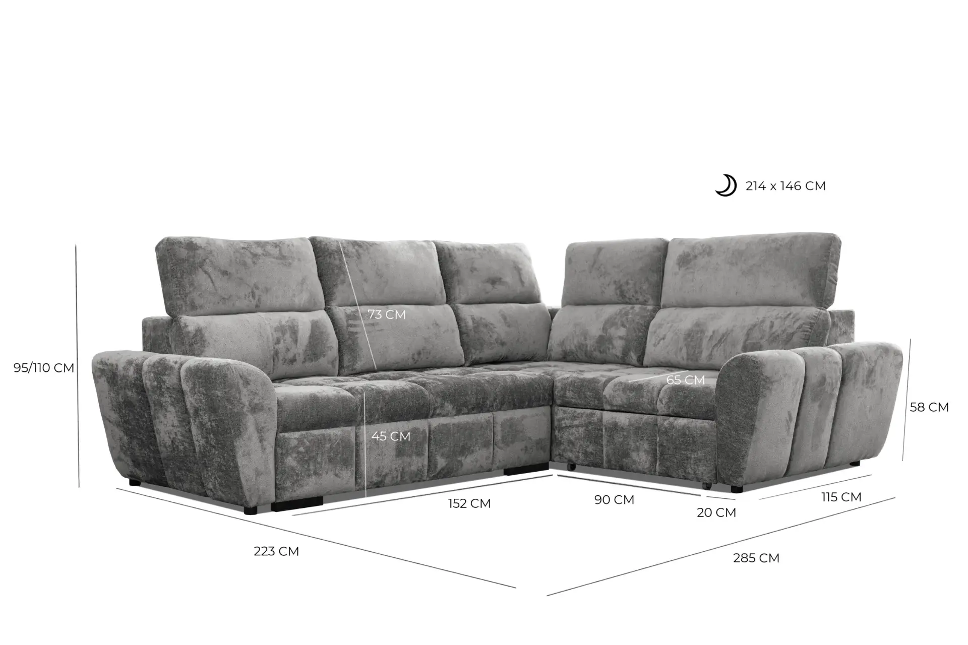 - Rozměry: 285 cm x 223 cm (celkem) / 45 cm x 95/110 cm (výška sedáku x výška opěradla)
